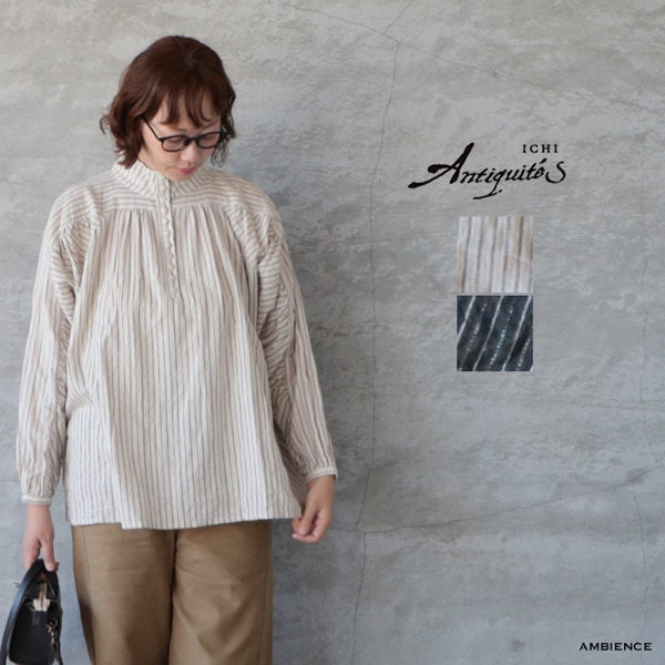 ICHI Antiquite's イチアンティークス Antiquite's SHIRRING BRUSHED STRIPE SHIRT シャーリングストライプシャツ ゆうパック発送 日本製 25秋冬