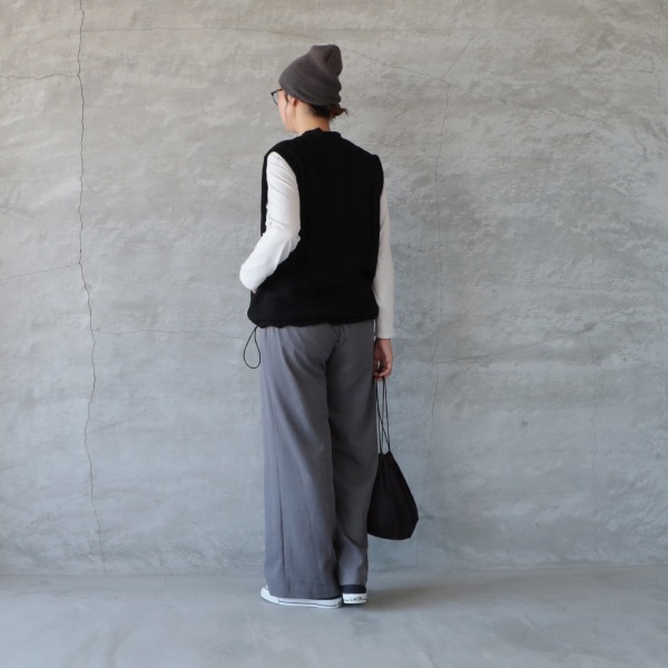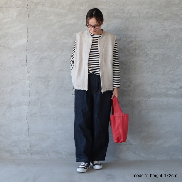 シャツやカットソー、ニットなどの上にも重ねやすいデザイン。